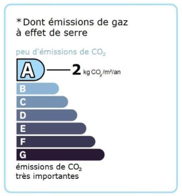- Émission gaz à effet de serre : Classe A (2kgCO2/m2/an)